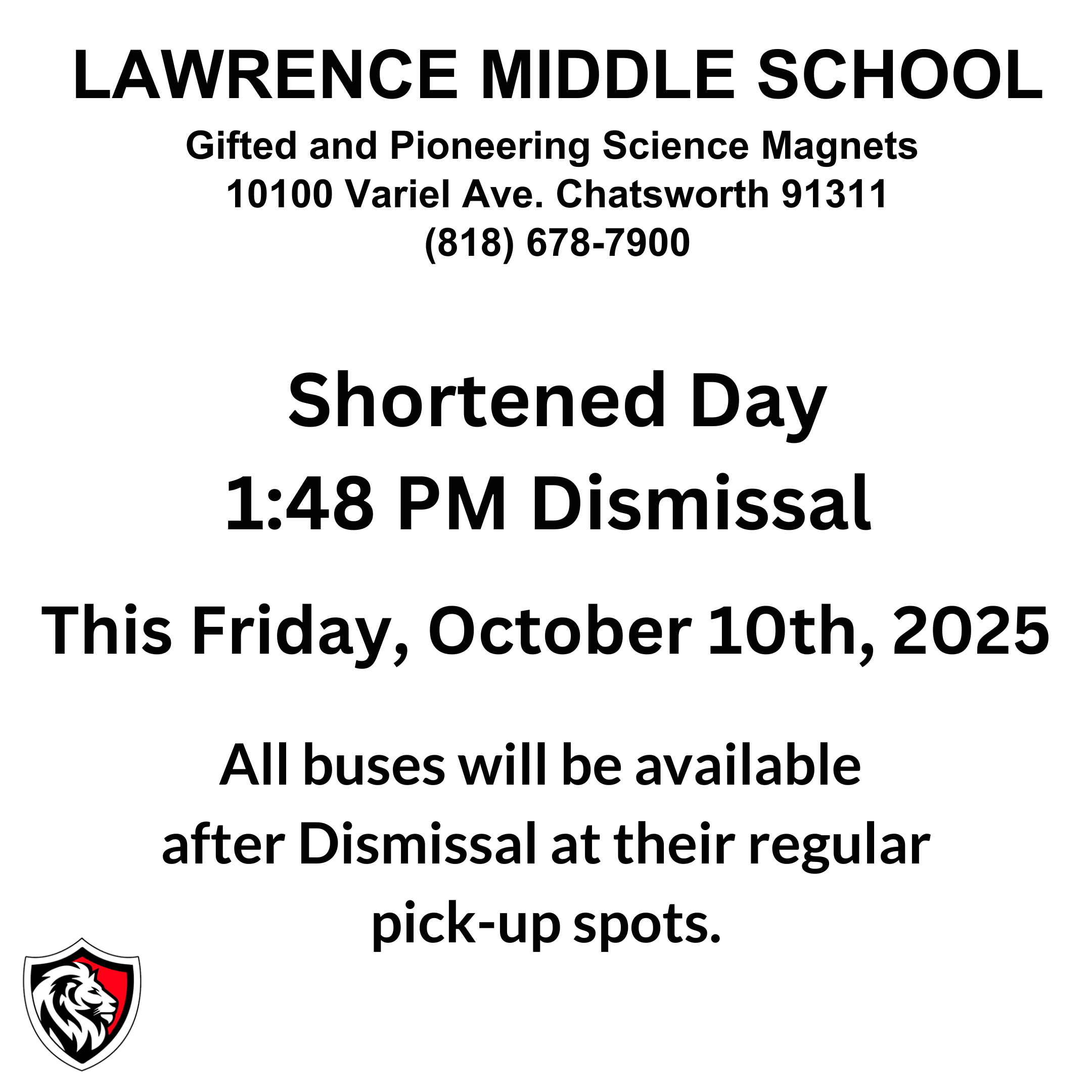 This Friday, October 10th, 2025 - Shortened Day 1:48 PM Dismissal All buses will be available after Dismissal at their regular pick-up spots.