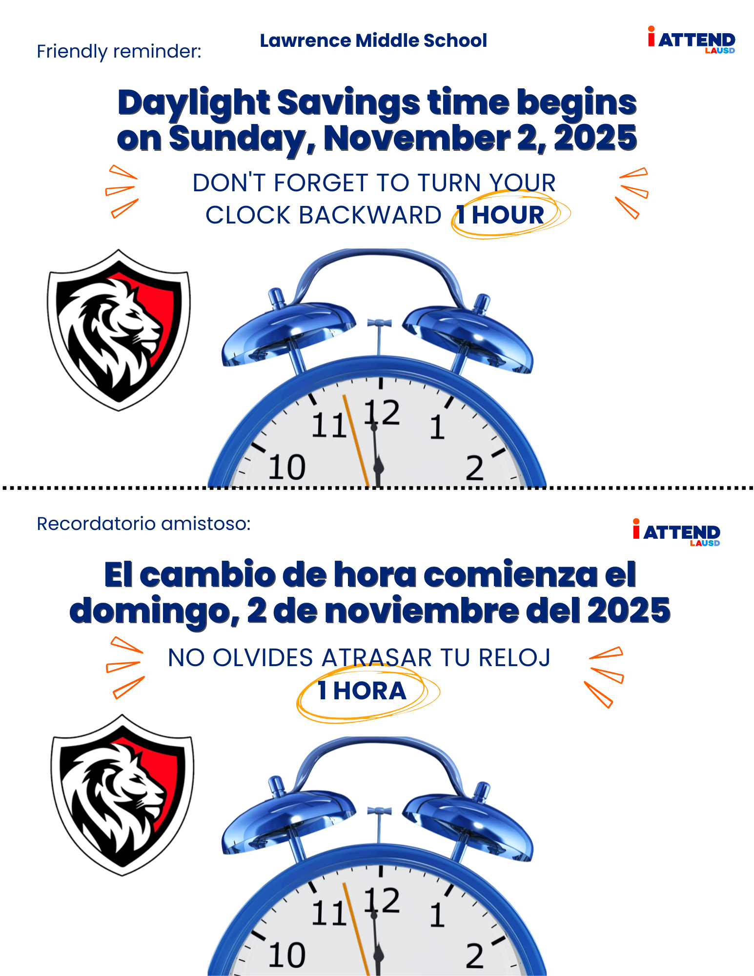 Daylight Savings friendly reminder Don't forget to turn your clock backward 1 hour on Sunday, November 2nd
